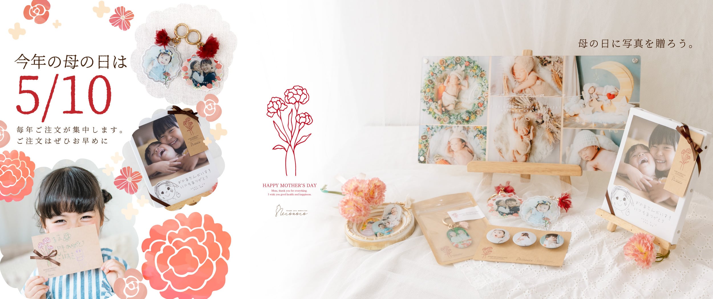 【ギフトキャンペーン】 母の日ギフト(〜5/31) 詳細はこちら→https://necco.theshop.jp/p/00007 ┈┈┈┈┈┈┈┈┈┈┈┈┈ 今しか描けない絵。今しか撮れない写真。 子供の成長は本当に早いから、両方きれいに残したい。 そんな願いに寄り添った特別なフォトチャーム出来ました。 かけがえのない時間を ぎゅっと閉じ込めて。 見るたびに思い出がリンクする neconocoオリジナルPhotoPrintCharm \ Memory Link / お写真は裏面印刷でツルツルキラキラ。光の反射が美しいです。 イラストのプリント面はレジンコーティングでぷっくりかわいい仕上がりに。 ┈┈┈┈┈┈┈┈┈┈┈┈┈ ■ サイズ 丸型S :直径40mm 丸型M:直径50mm 窓型S :約35×50mm 窓型M:約50×70mm ラウンドM:約35×57mm ラウンドL :約45×75mm ■ 素 材 アクリル(厚さ3mm)+UVプリント+キーチャーム+UVレジン 「裏面コーティング」 印刷面をよりきれいに保つ人気のコーティングオプションがあらかじめセットになっております。(素材:UVレジン) ⸻ 【 お届けまでの流れ 】 1. ご希望のサイズ・オプションを選んで購入 2. 2つの写真のデータ(①お写真 ②イラストを撮影したお写真)と 「お入れする文字、イラスト・文字のカラー番号、文字のデザイン番号」を LINEかメールで送信 3. 確認画像で仕上がりイメージチェック (通常2〜4営業日程度でデザイナーよりお送りします) 4. ご確認後に、必要な調整・修正点をお知らせください 写真の差し替え、文字内容の変更も可能。 (通常1〜3回程度のやりとりが必要です) 5. OK後に制作スタート! (デザイン確定後、通常5営業日程度で発送) 【 お写真の送付先 】 neconocoのLINEまたはメールに「ご購入サイト(BASE)・ご注文者様のお名前」を記載しお送りください。 高解像度のお写真をお選びいただくと仕上がりが綺麗です。 LINE登録はこちらから 「 https://lin.ee/gNpeVX9 」 LINE ID 「 @616sxoli 」 入稿用メールアドレス 「 [email protected] 」 ⸻ 【 キレイに仕上げるためのポイント 】 ・「 白い紙 」に太めの「 黒いペン 」で、余白を持って描く ・明るい場所で、真上から撮影する ※上記の条件でなくても作成可能です。お気軽にご相談ください。 ※イラストのプリント面はレジンコーティング仕上げとなります。 素材の性質上、細かな気泡やレジン液のゆらぎ等が入る場合があります。あらかじめご了承ください。 ⸻ 【 各オプションについて 】 「 コットンフラワー 」 シンプルの中にも高級感とナチュラルな素材感を組み合わせました。 お好みのカラーをお選びください。 「 ギフトパッケージ 」 特別なギフトパッケージもご用意しました。クラフト素材のジップバックで特別なフォトギフトに。 ご自宅用はもちろん、贈り物にもおすすめです。 ⸻ 【 スムーズなお取引とご満足いただける仕上がりのために 】 ・ご購入の際の注意点▶︎▶︎▶︎ https://necco.theshop.jp/p/00002 ・発送・配送に関する注意点▶︎▶︎▶︎ https://necco.theshop.jp/p/00014 ご注文前に必ずご確認ください。 ⸻ ▷neconoco KODOMONOE collection https://necco.theshop.jp/p/00015 ▷Instagram https://www.instagram.com/neconoco/