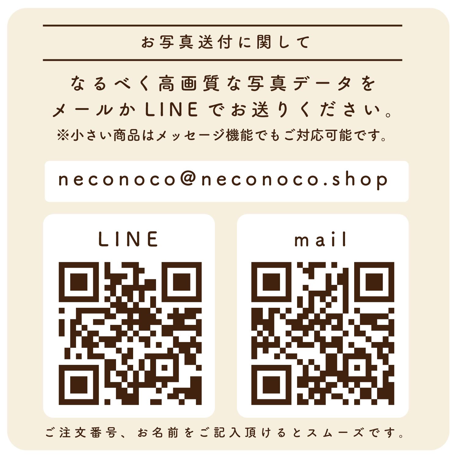 neconocoのLINEまたはメールに「ご購入サイト(BASE)・ご注文者様のお名前」を記載しお送りください。