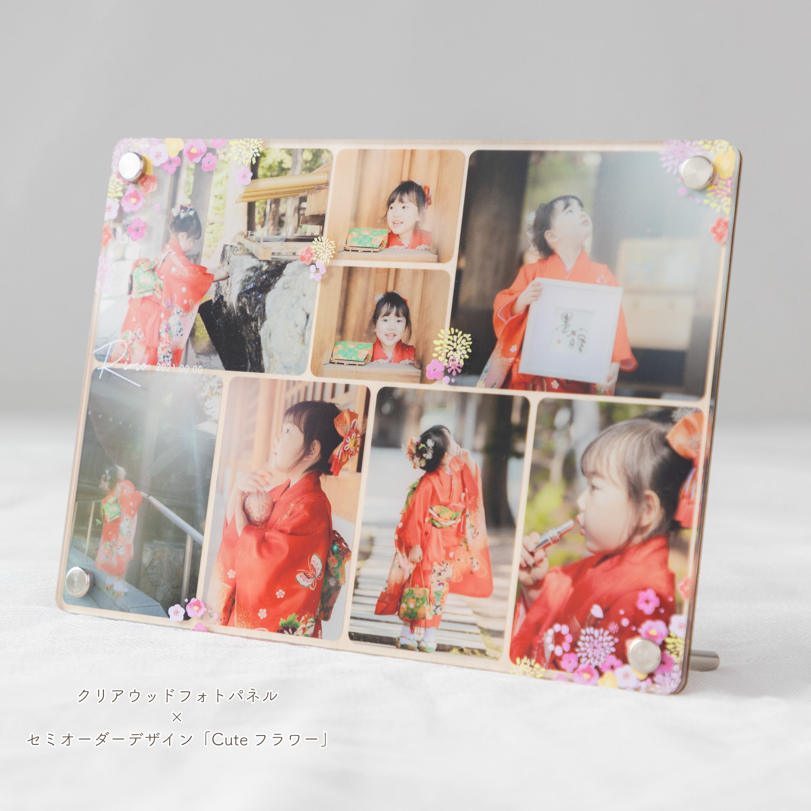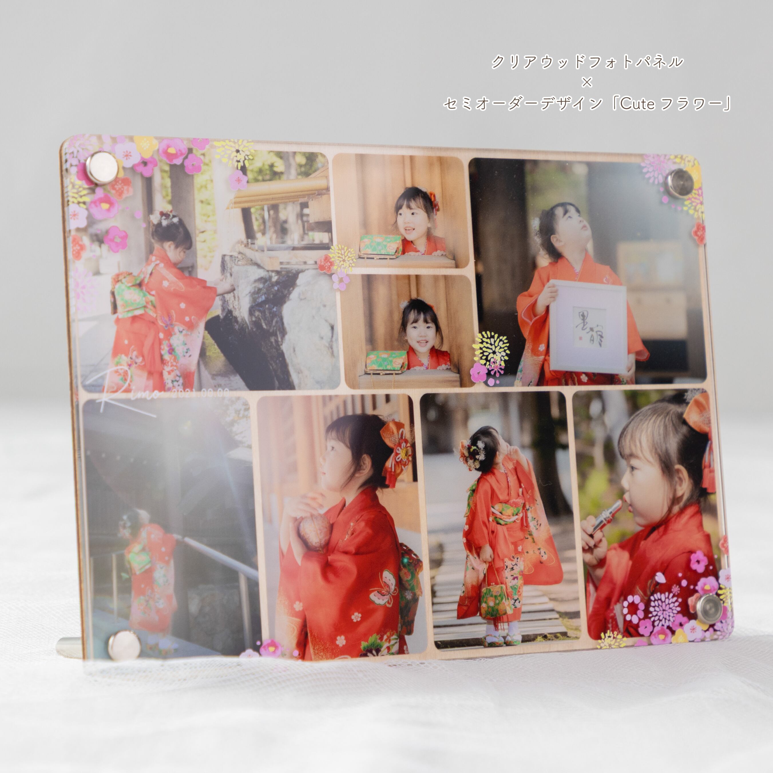 お写真の合間から覗く木目と、所々に散りばめたお花が美しく調和し、